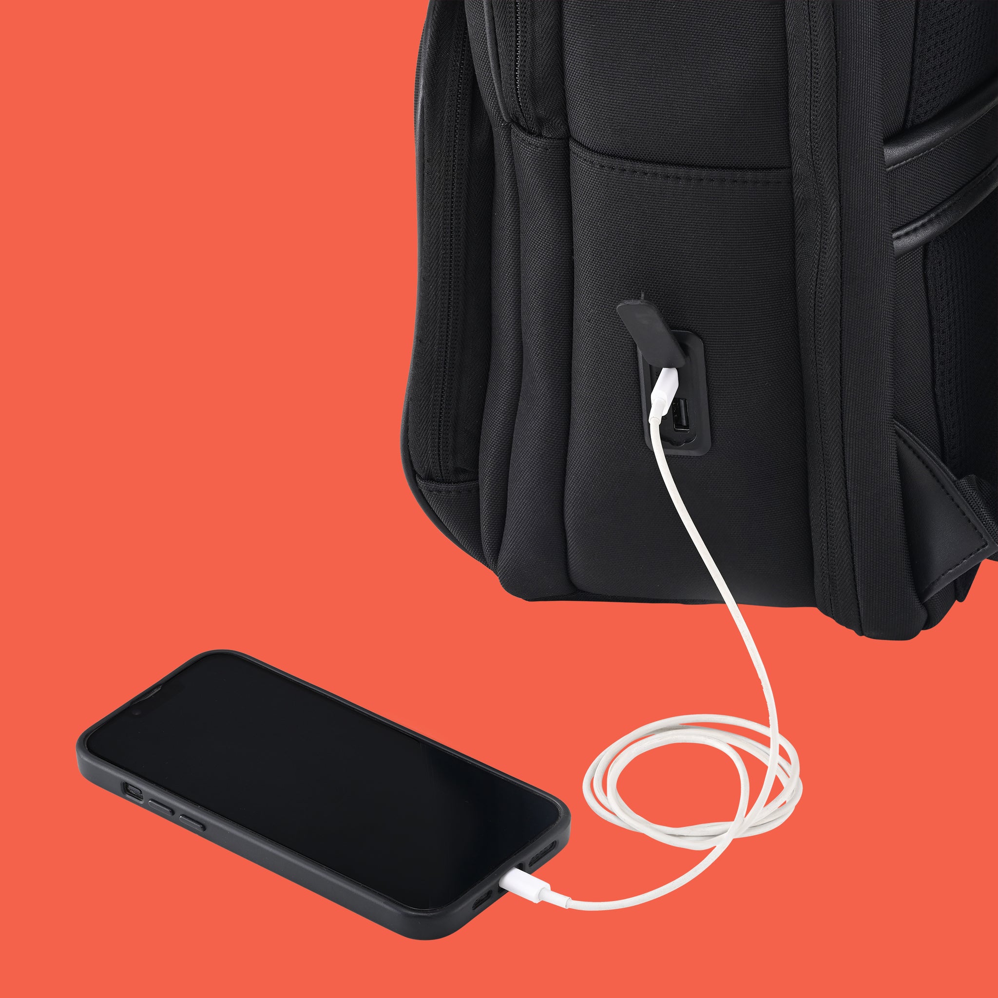 The backpack offers an external Type-A as well as a Type-C charging port for charging your tech products on the go by plugging your power bank inside the backpack with the provided internal ports.